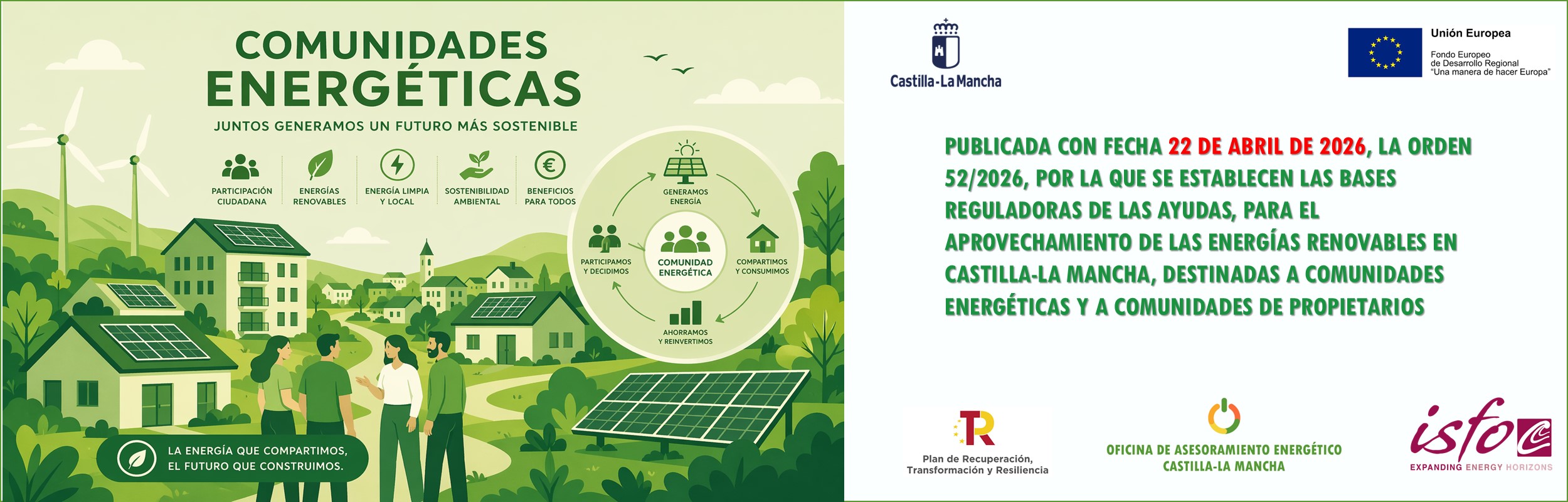 La Oficina de Asesoramiento Energético promueve la creación Comunidades Energéticas en Castilla-La Mancha. Para cualquier cuestión relacionada con las Comunidades Energéticas contacte a través del teléfono: 926 100 440.Comunidades Energéticas: